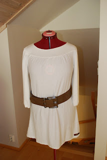 Tunika i burgundermønstret bomull med svart kantebånd på ermer og i hals. Knapp i halsen.